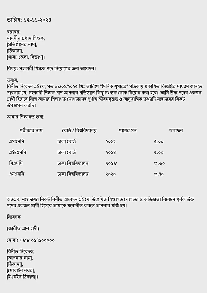 বিনীত নিবেদন এই যে, গত ১৫-০৮-২০২৫ তারিখে “দৈনিক যুগান্তর” পত্রিকায় প্রকাশিত বিজ্ঞপ্তির মাধ্যমে জানতে পারলাম যে, আপনার প্রতিষ্ঠানে সহকারী শিক্ষক পদে কিছুসংখ্যক শিক্ষক নিয়োগ করা হবে। আমি উক্ত পদে আবেদনকারী হিসেবে আমার শিক্ষাগত যোগ্যতা, অভিজ্ঞতা এবং অন্যান্য তথ্য নিচে উপস্থাপন করছি।
