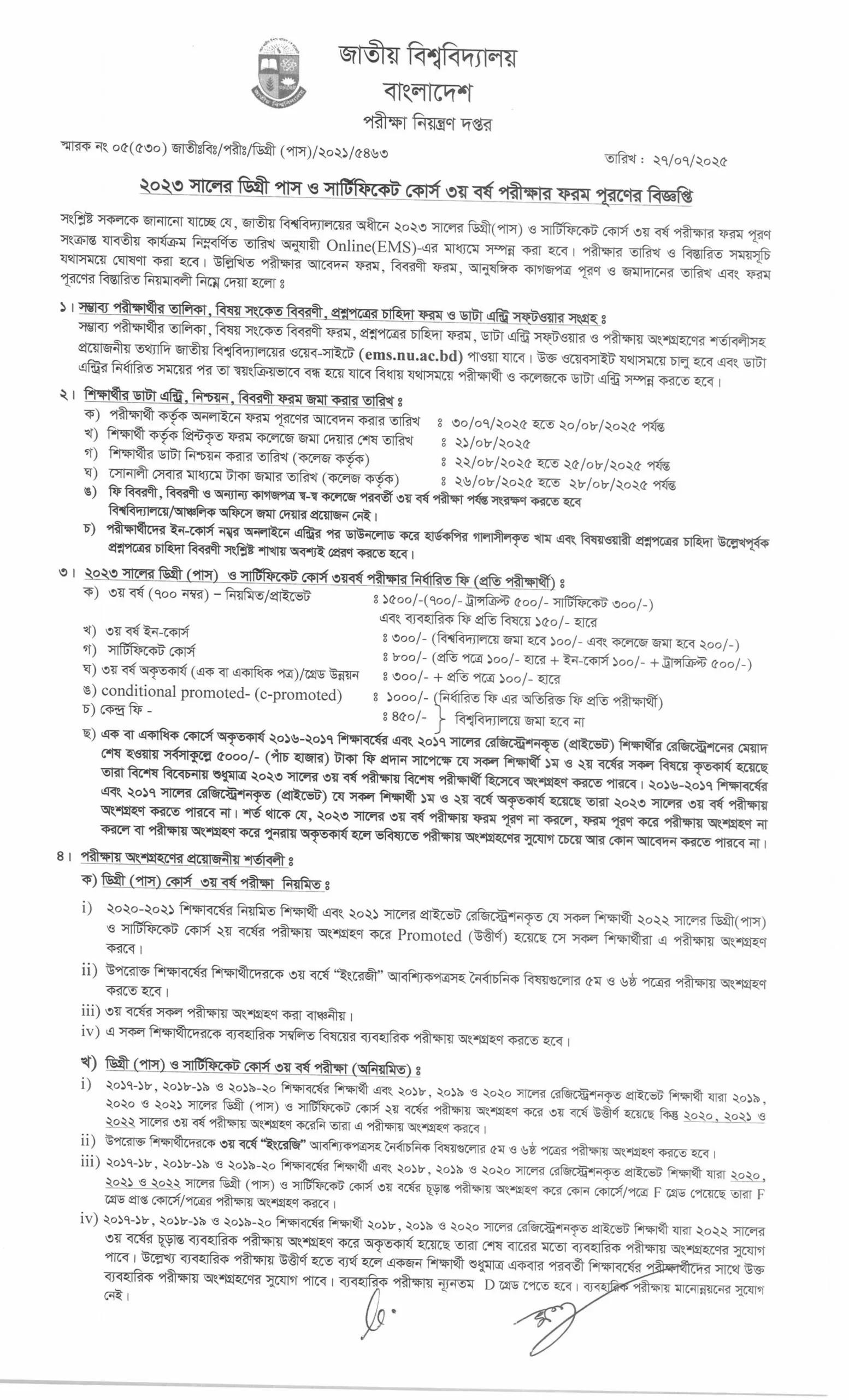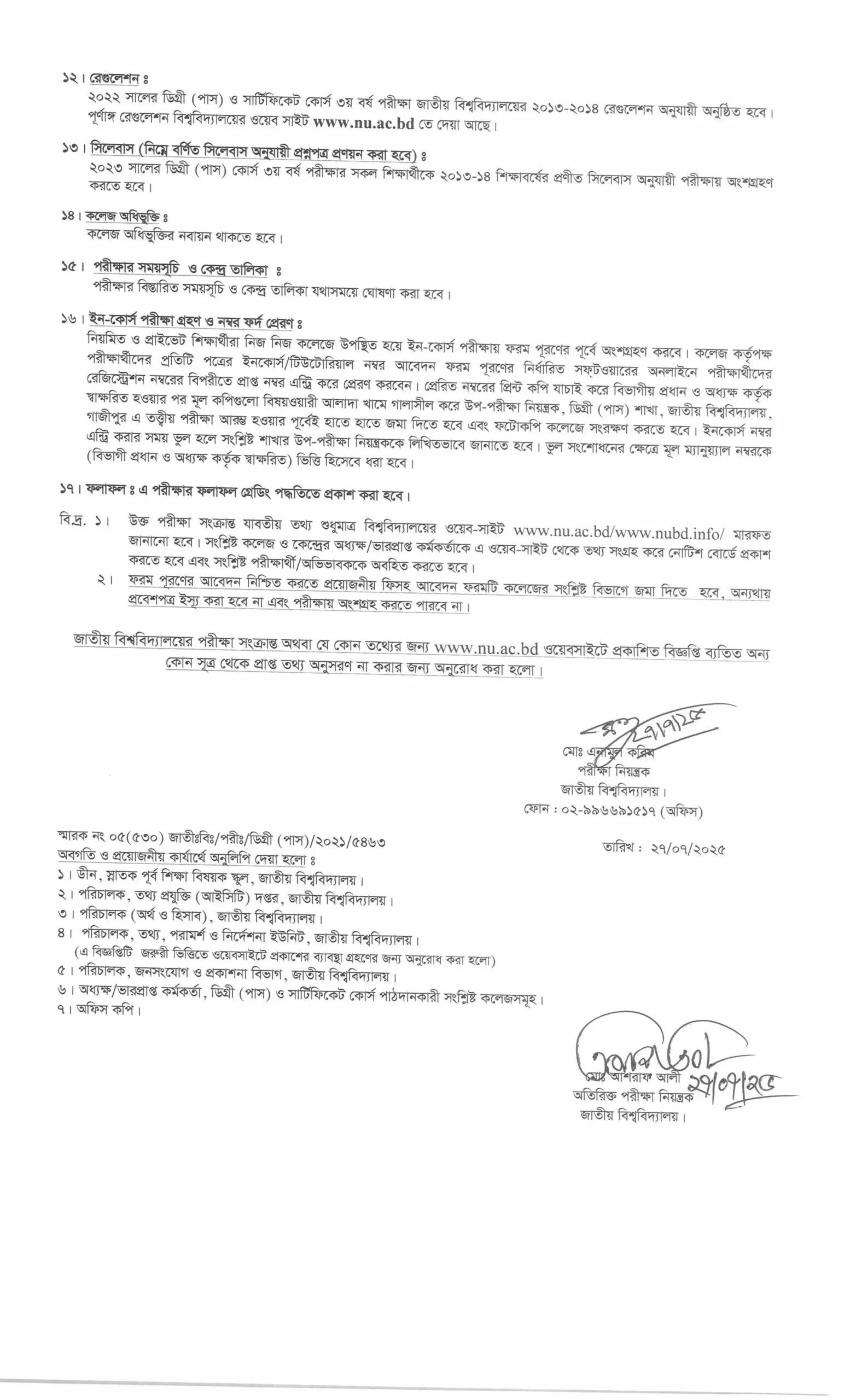 ২০২৩ সালের ডিগ্রি পাস ও সার্টিফিকেট কোর্স ৩য় বর্ষ পরীক্ষা ২০১৩-২০১৪ শিক্ষাবর্ষের রেগুলেশন অনুযায়ী অনুষ্ঠিত হবে। এই রেগুলেশন বিশ্ববিদ্যালয়ের ওয়েবসাইট www.nu.ac.bd/home এর academics মেনুর syllabus অপশনে পাওয়া যাবে। শিক্ষার্থীদের এই সিলেবাস অনুযায়ী প্রস্তুতি নিতে হবে। প্রশ্নপত্রও এই সিলেবাসের ভিত্তিতে প্রণয়ন করা হবে।