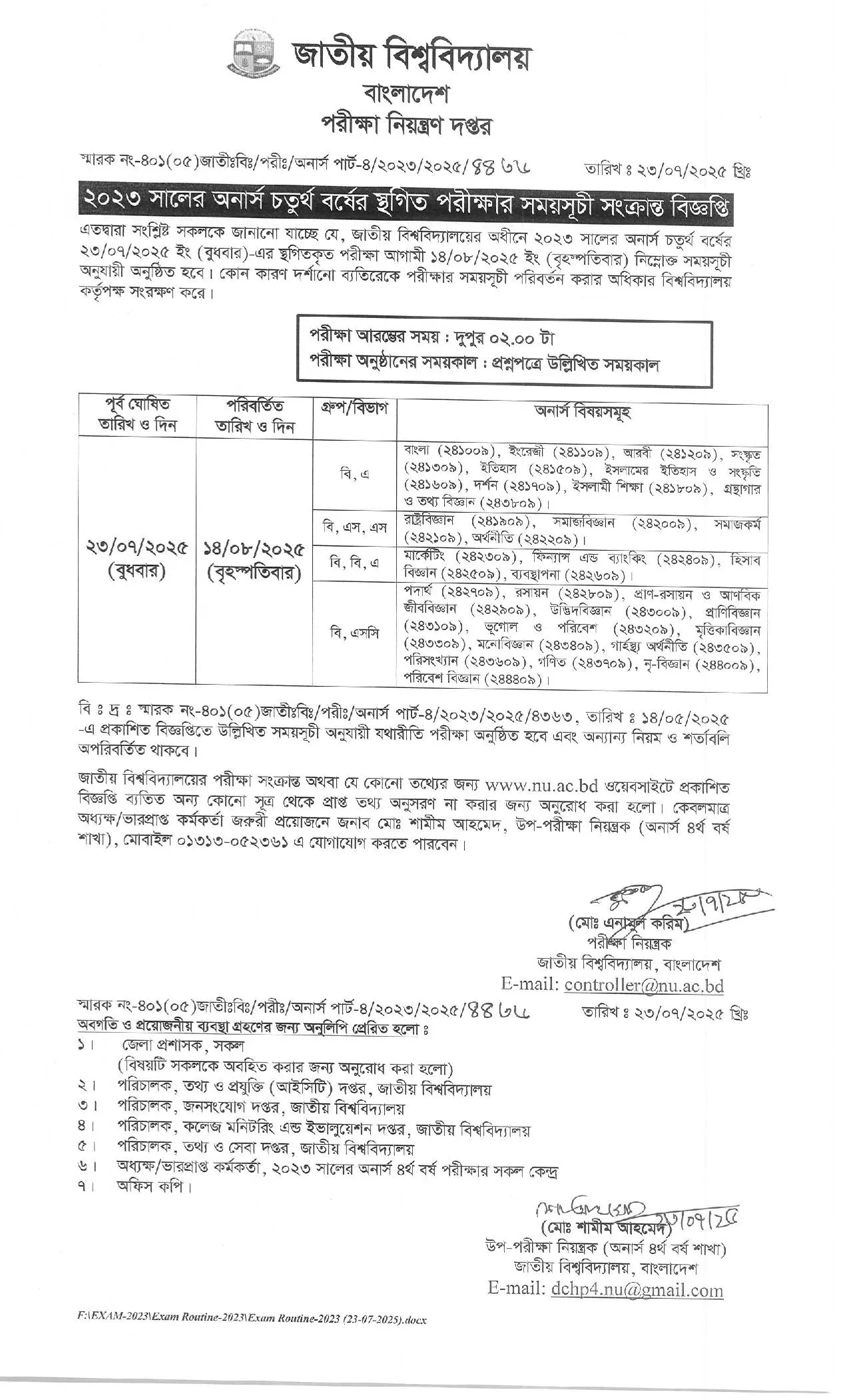 জাতীয় বিশ্ববিদ্যালয়ের অফিসিয়াল বিজ্ঞপ্তি অনুযায়ী, ২০২৩ সালের অনার্স ৪র্থ বর্ষের পরীক্ষা, যা গত ২৩ জুলাই ২০২৫ তারিখে স্থগিত করা হয়েছিল, তা নতুন সময়সূচী অনুযায়ী অনুষ্ঠিত হবে। বিশ্ববিদ্যালয় কর্তৃপক্ষ ২৩ জুলাই রাতে তাদের অফিসিয়াল ওয়েবসাইটে এই সংশোধিত রুটিন প্রকাশ করে। নতুন সময়সূচী অনুসারে, স্থগিত হওয়া পরীক্ষা আগামী ১৪ আগস্ট ২০২৫, বৃহস্পতিবার অনুষ্ঠিত হবে।